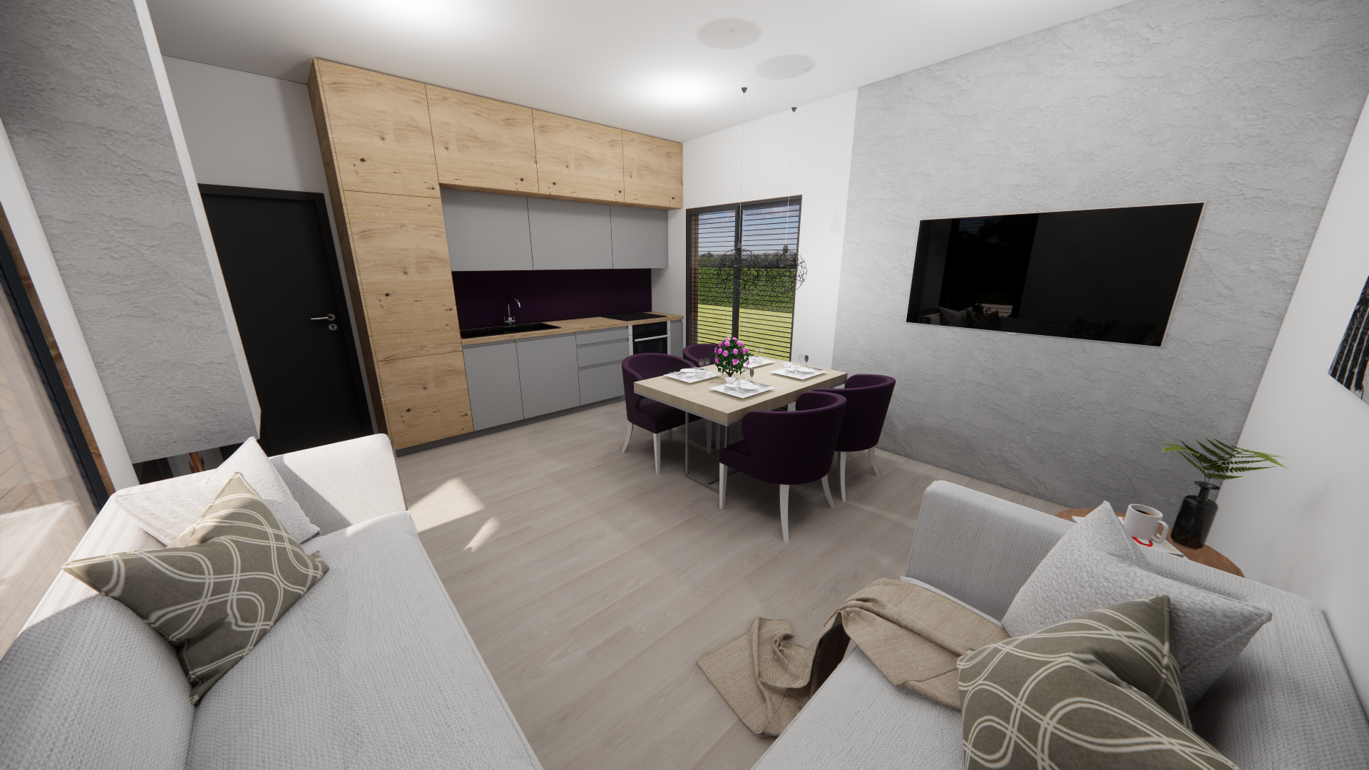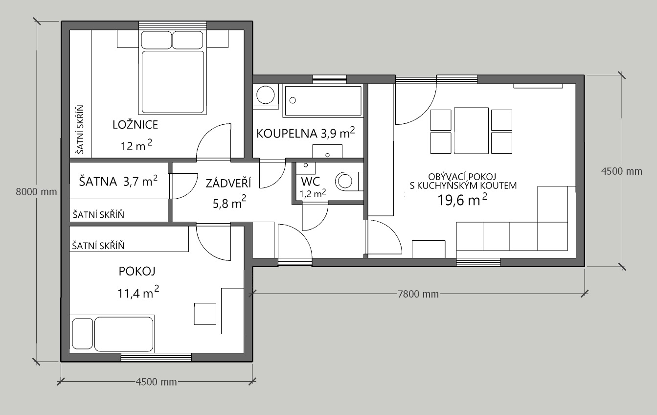 MINI XXL je dům dispozice 3+kk a poskytuje velmi komfortní zázemí pro bydlení rodiny. Obytná část domu je tvořena obývacím pokojem s kuchyní a jídelním koutem. V protilehlé části domu je vstup do pokoje,který může sloužit jako dětský pokoj, studentský pokoj, případně také jako pracovna. Přes chodbu je umístěna ložnice. Tyto dva pokoje dělí šatna, případně technická místnost. Střed domu tvoří prostorná chodba, koupelna a samostatné WC.
